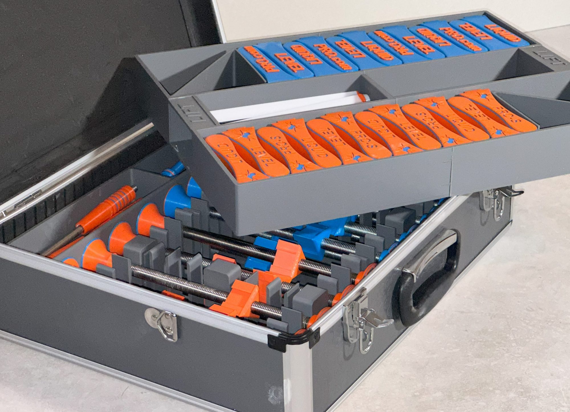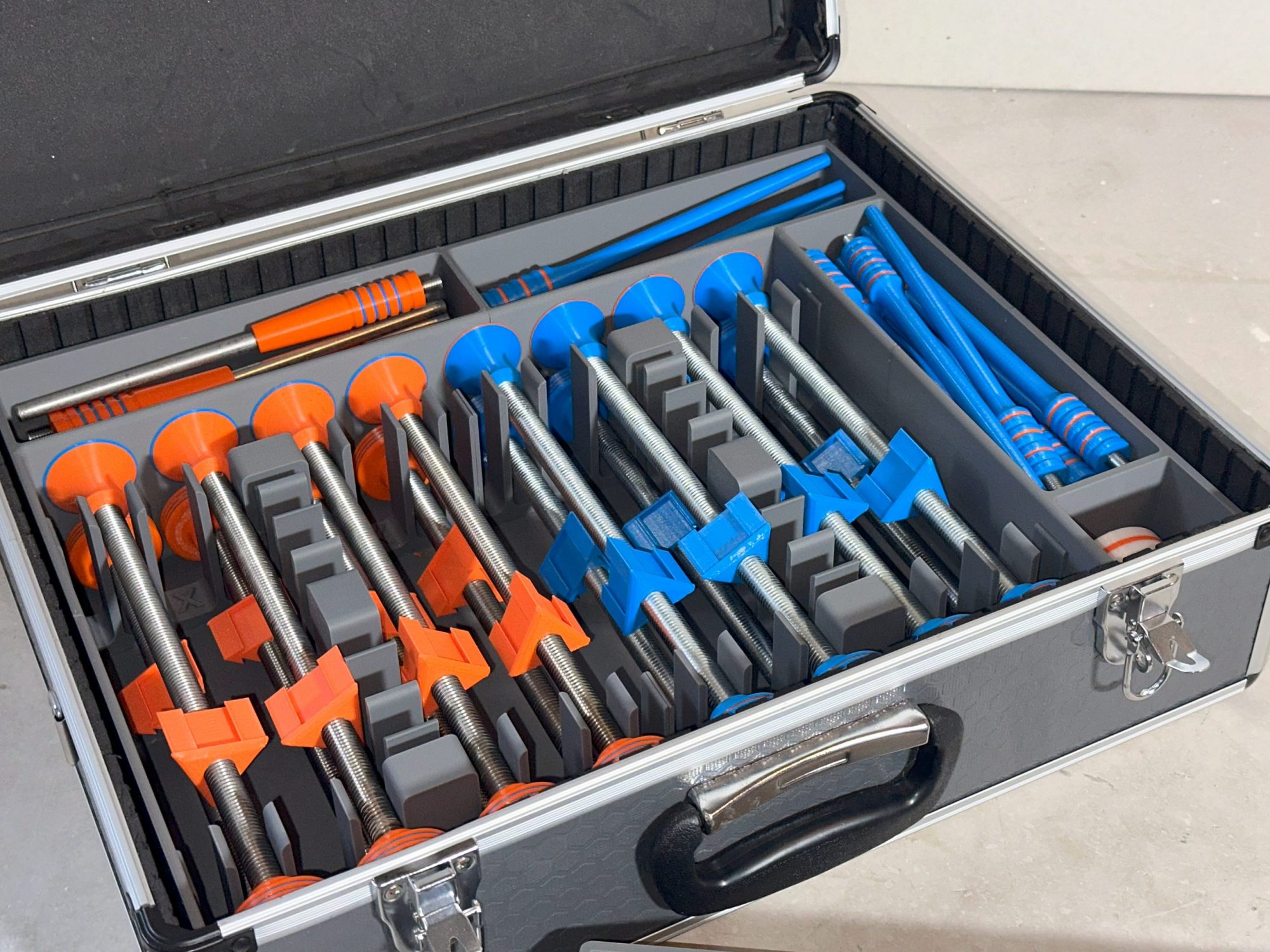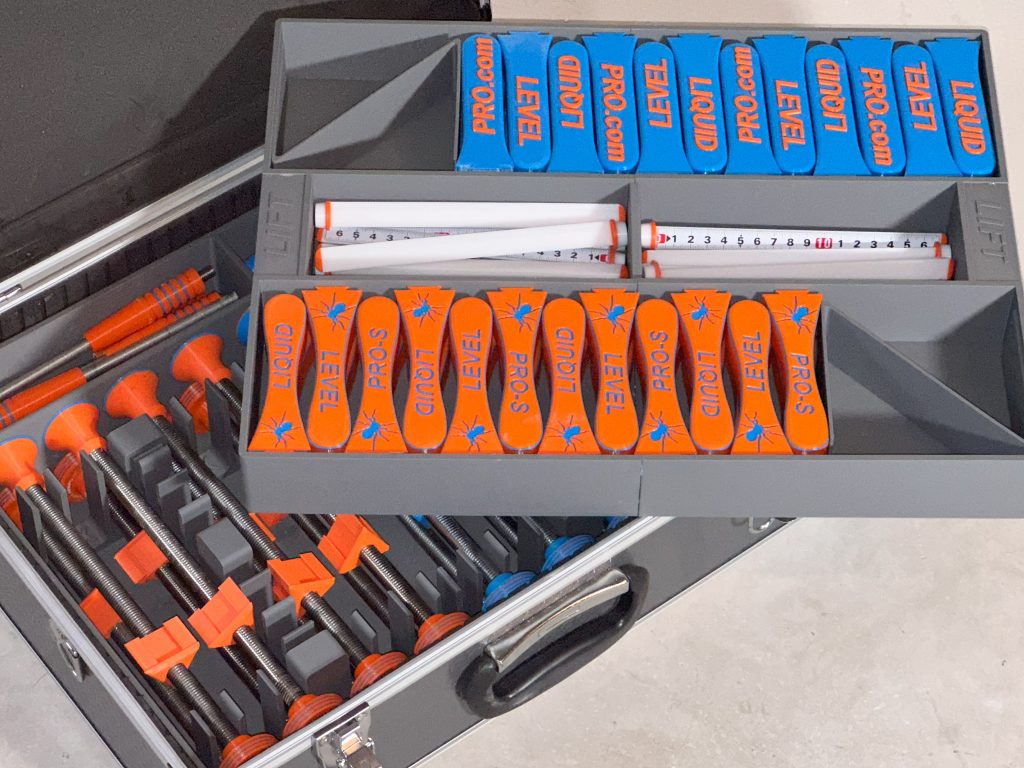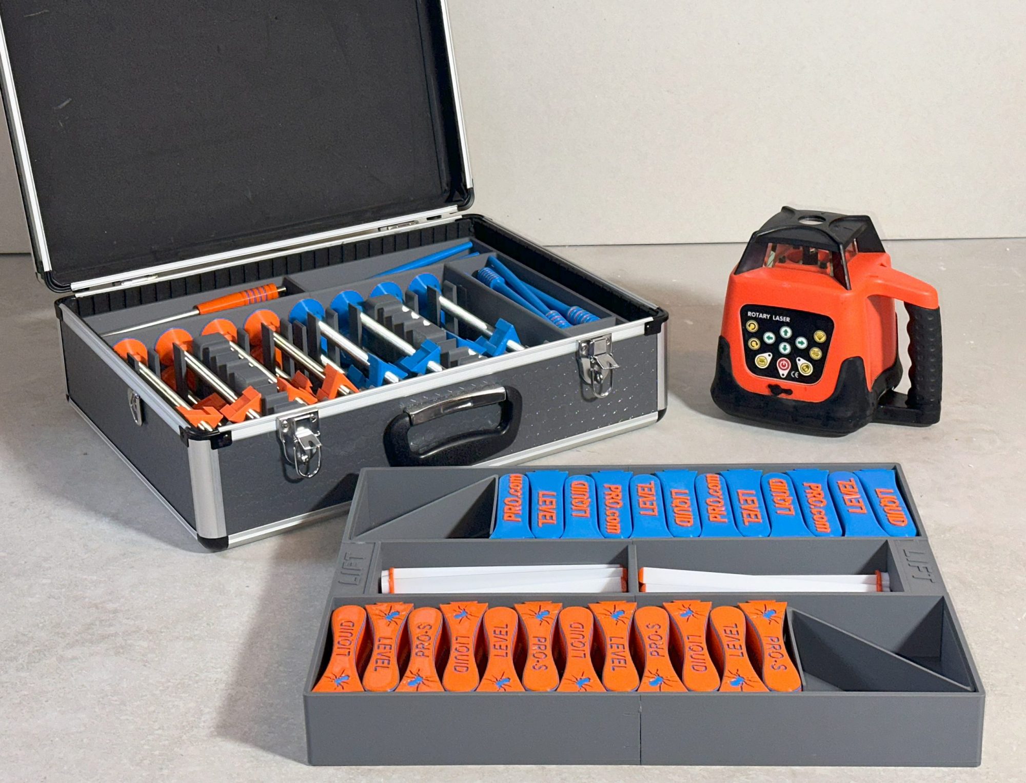Each case has the capacity to hold 8, 16, or 20 levelling spiders, laser measures, and a line laser adapter. The threaded bar main bodies are compartmentalised to ensure easy access with minimal hassle, while the arms and measures rest comfortably in the upper tray.